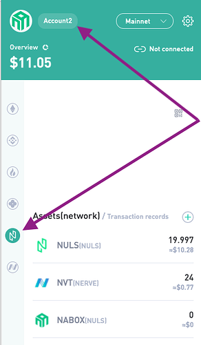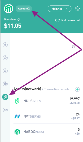 - Nabox will hold accounts from different chains, and multiple accounts from each chain. You need to specify the account you are using and the chain. Make sure you have selected the right NULS account and the NULS logo in the sidebar.