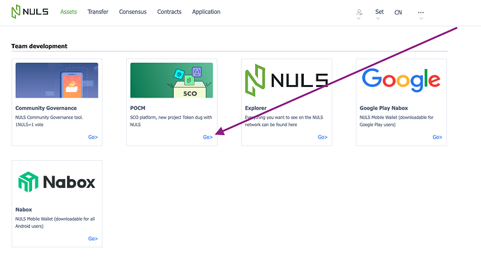 - The NULS wallet and the SCO platform connect, and with the POCM platform. In a new window, the SCO platform opens, identified with the URL POCM-An SCO Platform.
