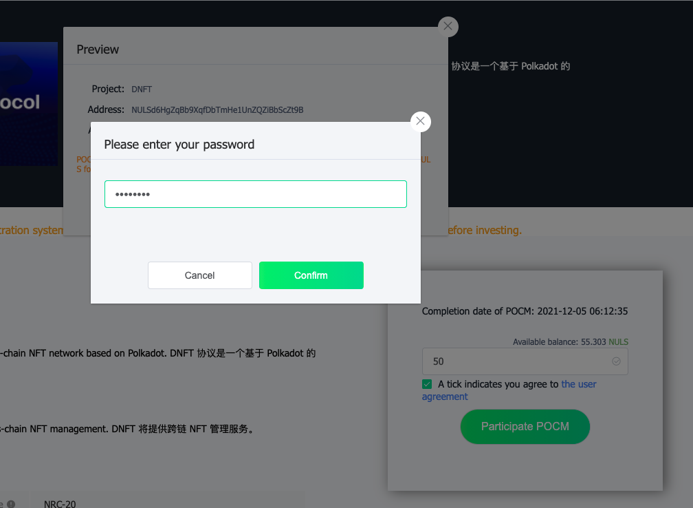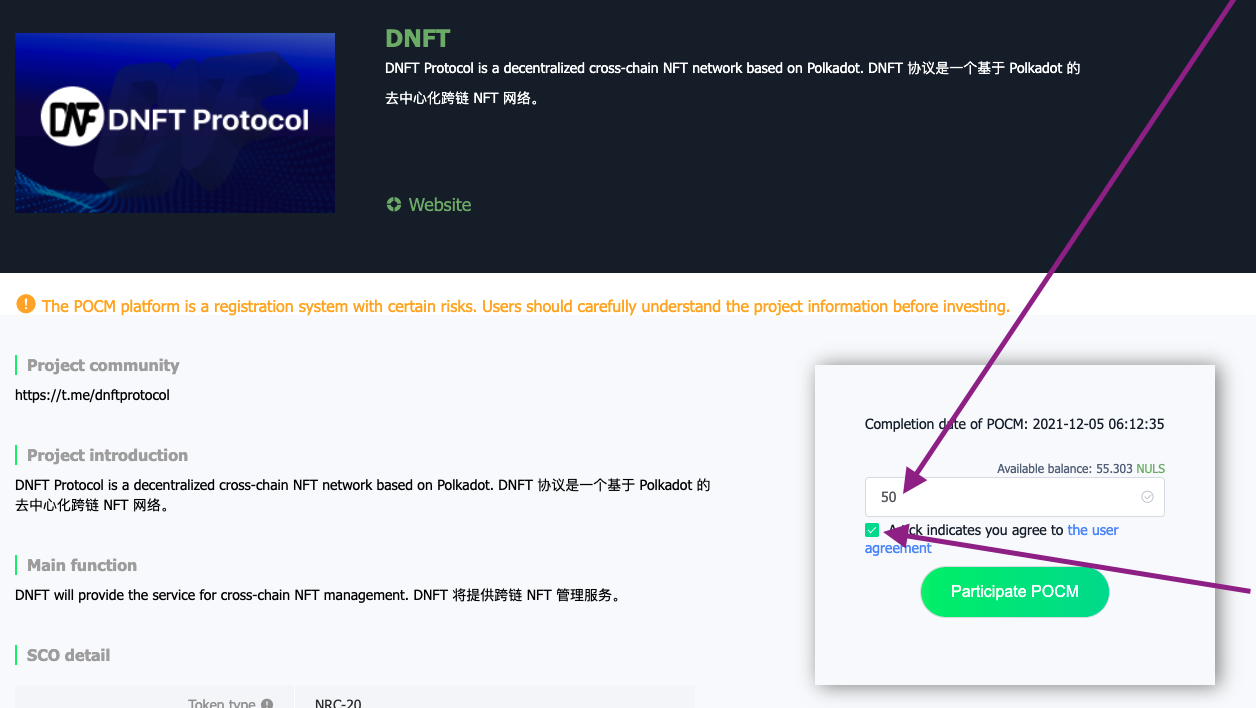- For this example, the project DNFT Protocol has been selected. To stake, enter the amount of NULS. Each project has a minimum staking amount. Read the user agreement and then check the box indicating that you have read the agreement. You are ready to stake. Select Participate POCM.