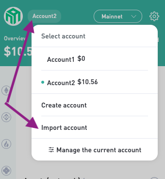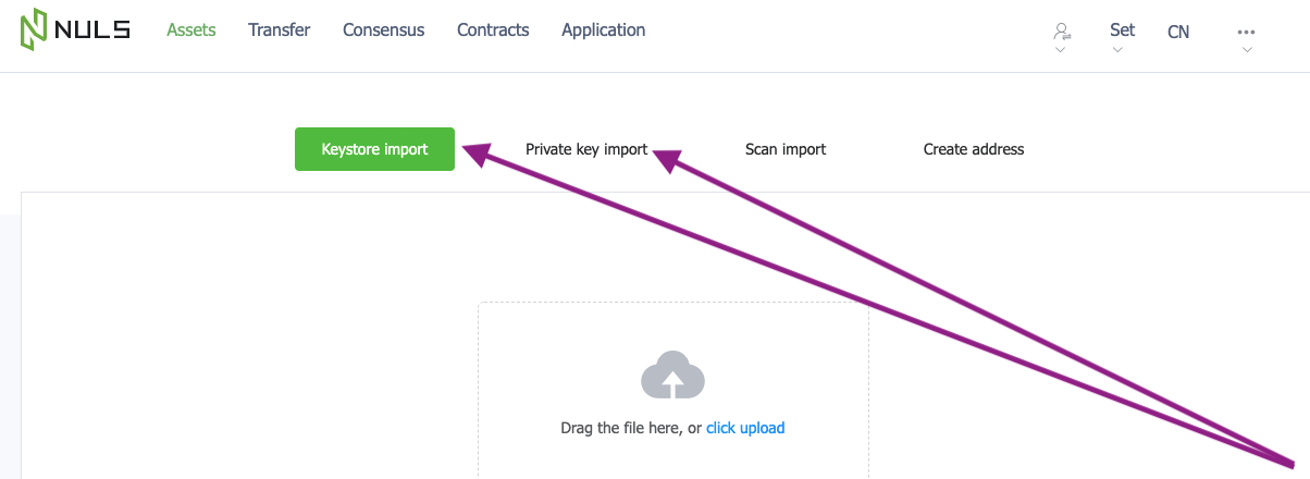 - Import your NULS account into the Wallet, using the keystore or private key.