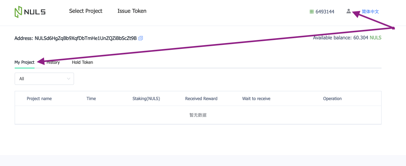 - In the User Center your account and balance are displayed. The My Project option is the most frequently used option. “My Project” shows you all the projects you are currently staked in, the tokens you have received, and the tokens that are available for you to receive.